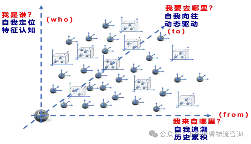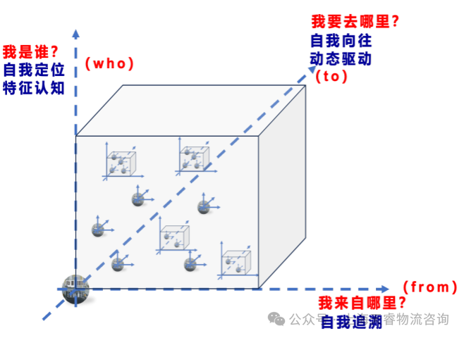 在對物料方向感進行初步探討后,接下來的問題是如何實現(xiàn)知識遷移,即在智能制造工廠和供應鏈中,如何為物料(或產(chǎn)品、訂單)定義動態(tài)坐標。因為在我們管理制造企業(yè)物流的過程中,我們經(jīng)常會在困惑中思考:這個物料是什么東西?是哪里來的?應該去哪里?物料的三維坐標圖,如圖1所示。