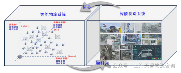假定每個物料或物料組都具有方向感,明確其來源和目的地,這就要求智能制造系統(tǒng)需要人、機、料、法、環(huán)、測之間的信息互通,需要物料能夠“說話”。當每個物流單元或物料單元(SU,Smart Unit)能主動表達其歷史、狀態(tài)與需求時,就能顯著減少對人工判斷的依賴,大大降低物流管理的復雜度。
