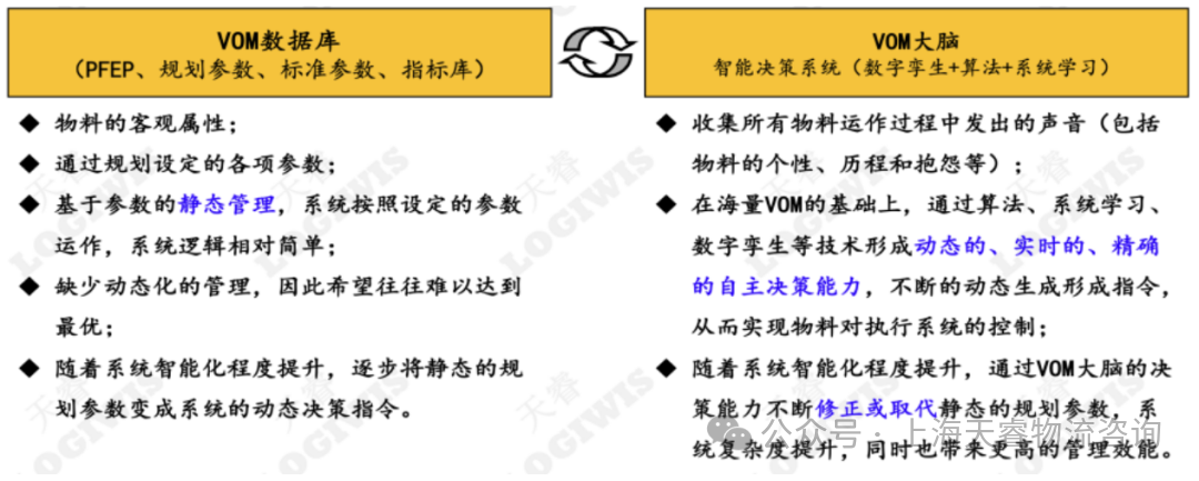 VOM系統(tǒng)的邏輯架構展現(xiàn)了數(shù)據(jù)庫與大腦之間的雙向互動關系。VOM數(shù)據(jù)庫作為基礎支撐,存儲和管理物料的客觀屬性、規(guī)劃參數(shù)以及標準指標,通過靜態(tài)管理為系統(tǒng)運作提供基礎框架。然而,這種靜態(tài)管理模式存在優(yōu)化空間的局限性。隨著系統(tǒng)智能化水平提升,VOM大腦能夠基于實時數(shù)據(jù)不斷優(yōu)化和更新靜態(tài)規(guī)劃參數(shù),從而推動系統(tǒng)從靜態(tài)管理向動態(tài)決策演進,提升系統(tǒng)的適應性和管理效能。在這種數(shù)據(jù)庫與大腦的協(xié)同互動過程中,就實現(xiàn)了從靜態(tài)規(guī)劃到動態(tài)優(yōu)化的轉(zhuǎn)變。