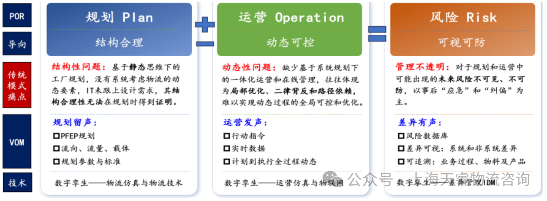 在實施過程中,需要確保P(規(guī)劃)過程結構合理、O(運營)過程動態(tài)可控、R(風險)過程可視可防。針對傳統(tǒng)模式中存在的結構性問題、動態(tài)性問題和管理透明度問題,VOM模型強調(diào)在規(guī)劃的過程能夠給物料“留聲音”;在運營的過程,希望物料“能夠發(fā)聲”;在風險的過程,希望物料針對差異能夠發(fā)出自己“‘抱怨的’聲音”。技術支撐方面,可通過數(shù)字孿生實現(xiàn):在規(guī)劃階段應用物流仿真和物流技術,在運營階段應用運營仿真和物聯(lián)網(wǎng)技術,在風險控制階段則通過差異管理、數(shù)據(jù)驅(qū)動以及人工智能AI來實現(xiàn)自我監(jiān)控和自我調(diào)整。