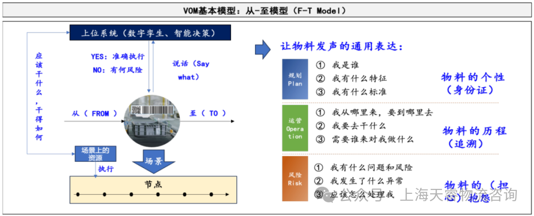 類似的邏輯在制造物流領域也具有重要啟示:物料同樣需要“知道”自身的身份(Who)、來源(From)、去向(To),以明確其在工廠和供應鏈物流系統(tǒng)中的坐標與運行軌跡。若物料缺乏這種“方向感”,就容易陷入被動與混亂狀態(tài),導致資源錯配和浪費,甚至引發(fā)系統(tǒng)崩潰。上述三問為物料規(guī)劃和調(diào)度提供了最樸素且務實的哲學起點,也是VOM思想的根源。