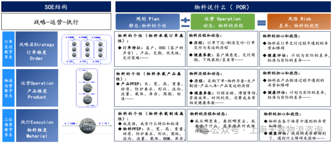 比如,SOE 結構里面分別分析物流戰(zhàn)略從運營到執(zhí)行的有效性和相關績效指標的達成能力,POR 的過程里面分析物料“說什么”“經(jīng)歷了什么”等。