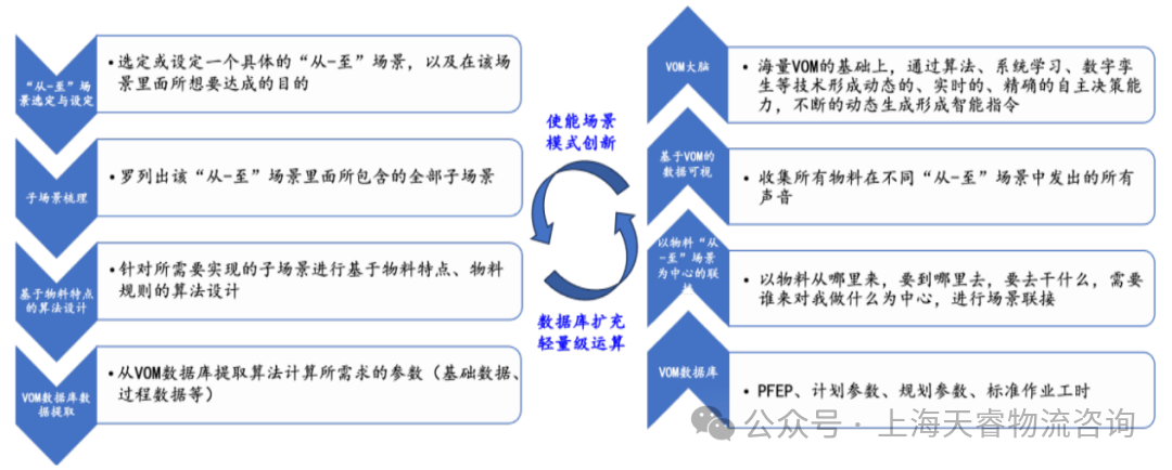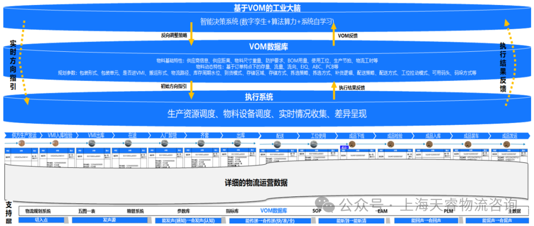 在VOM體系,要能夠做到切實執(zhí)行物流的執(zhí)行工位的叫料、物流的調(diào)度作業(yè)過程的差異管理。VOM的數(shù)據(jù)庫和PFEP規(guī)劃參數(shù)標準、參數(shù)指標庫,兩者之間互為前提、互為引用和修正關系,同時能夠引用,能夠反饋,也能夠集成物料的聲音。從技術支撐而言,它可以通過數(shù)字孿生、人工智能數(shù)字主線、機器人技術、算法、物聯(lián)網(wǎng)技術、大數(shù)據(jù)、物流技術、信息技術、自動識別技術、傳感技術等做有效支撐。所以,VOM 的系統(tǒng)邏輯核心是基于VOM的智能監(jiān)測系統(tǒng),通過模型算法、系統(tǒng)學習和數(shù)字孿生不斷的迭代,提升智能化水平,逐步實現(xiàn)物料的自主指揮系統(tǒng)。